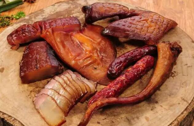 杀完年猪后,就开始熏腊肉。多年前,在没有冷藏方法的时代,腌熏风干,已是最佳的储肉方法。将腌好的肉放在火塘上的挂架上,利用灶内的青烟上升去熏制。熏好的腊肉肉质红亮,咸鲜适度,并具烟香之味,味道简直不摆了。