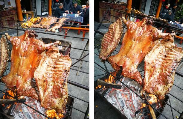 南山农家乐的烤全羊是农村放养的黑山羊,制作工艺也是非常讲究的,从拔毛到腌制,烘烤就要用将近一天的时间。