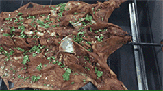在烤制的过程中,烤羊师傅们需要不停地翻羊、刷油,把烤羊秘制的调料均匀洒在羊的正反两侧。